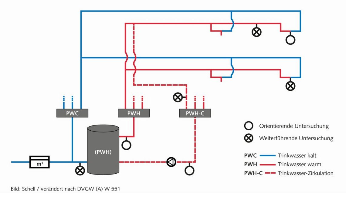 Stejné platí také pro studenou pitnou vodu. Jak je známo, tak nesmí v systému a na každém odběrném místě po vypuštění maximálně 3 litrů překročit 25 °C, měřeno také v objemu 250 ml (VDI 6023 list1). Pokud existují známky, že teplota studené vody překračuje 25 °C, je i u tzv. „studené vody“ povinné provádět testování legionelly v pitné vodě (pracovní listy DVGW W 551). Přitom platí, že je nutné dodržet minimální počet míst pro odběry vzorků (viz. grafiku).