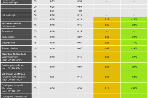 Tabelle 1: Beispiele für verringerte Berechnungsdurchflüsse (reduzierte Literleistungen) unter die Referenzwerte der DIN 1988-300, Tabelle 2, auf Basis marktverfügbarerer Entnahmearmaturen