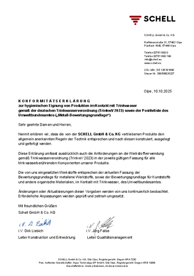 Konformitätserklärung zur hygienischen Eignung von Produkten im Kontakt mit Trinkwasser gemäß der deutschen Trinkwasserverordnung (TrinkwV 2023) sowie der Positivliste des Umweltbundesamtes („Metall-Bewertungsgrundlage“)