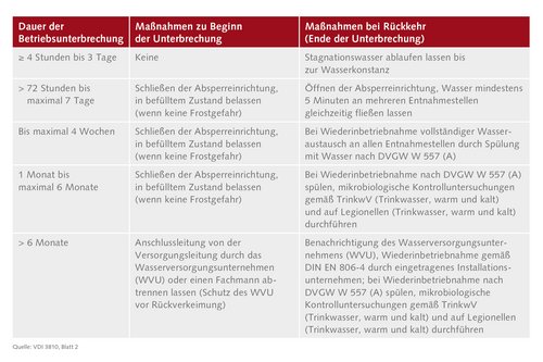 Wenn nach einer Nichtnutzung von 72 Stunden die Leitungen von Duschen, Waschtischarmaturen, Küchen, WCs und Urinalen für mindestens 72 Sekunden geöffnet werden, reicht dies meist aus, um Legionellen auszuspülen. Denn bei einer Armatur mit einer Literleistung von 5l/min sind das rund 6 Liter Wasser, also das Zweifache Volumen einer üblichen Stichleitung bis zu einem Abzweig in der Installation.