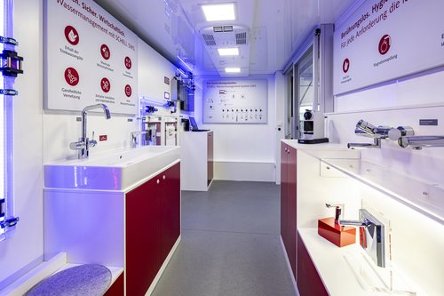 Schon von weitem wird es gut sichtbar sein, das Schell Mobil mit seinem signalroten Look. Im Inneren geht es dann spannend weiter, denn die Besucher erwartet ein komplett ausgestatteter Sanitärraum mit den wegweisenden Produkten und Systemen. Besonderes Highlight: Ausgewählte Armaturen sind an einen Wasserkreislauf angeschlossen, so werden die Wasserwege im Betrieb simuliert und die Produktdarstellung noch realistischer präsentiert. Weiterhin veranschaulicht moderne LED-Technik den Wasserfluss in Plexiglasrohren und an den Zapfstellen. Die Produktvorteile, wie zum Beispiel die von automatischen Stagnationsspülungen, werden so deutlich erkenn- und erlebbar. Die Roadshow führt das smarte Mobil durch Deutschland und Österreich sowie nach Südtirol.
