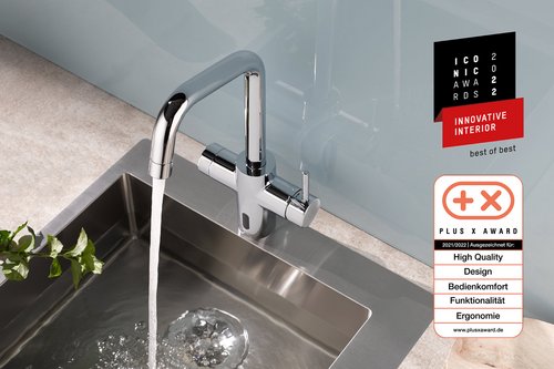 Und es gab direkt ein zweites Mal Grund zur Freude: Grandis E wurde bei den Iconic Awards: Innovative Interior 2022 ausgezeichnet. Dieses Trendbarometer der Einrichtungsbranche prämiert jährlich Produkte, die mit Ergonomie, Funktionalität, Bedienbarkeit, Gestaltungsqualität, Langlebigkeit und vielen weiteren Eigenschaften punkten. Der unabhängigen Jury aus Vertreter*innen der Bereiche Design, Handel und Medien fiel die Grandis E dabei besonders in Bezug auf Funktionalität und Bedienbarkeit, aber auch im Hinblick auf ihre Gestaltungsqualität und Langlebigkeit auf. In der Kategorie Gebäudeausstattung erhielt die Küchenarmatur darum die Prämierung als Best of Best.