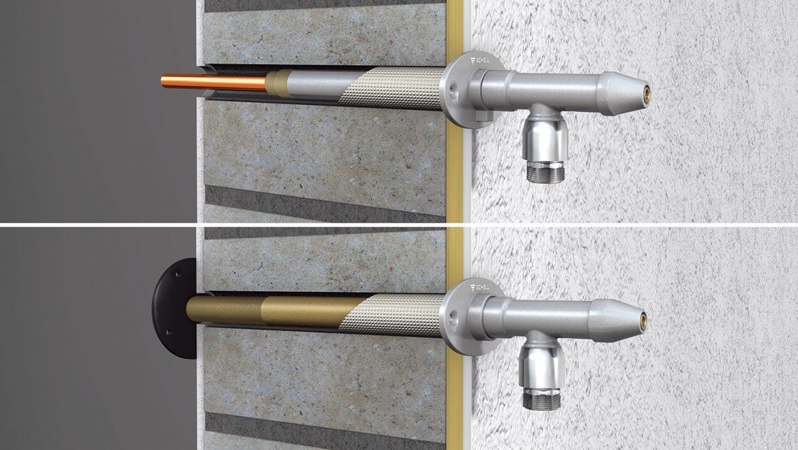 Grâce au kit POLAR II, la protection antigel efficace de SCHELL est également disponible dans un kit d’installation pour gros-œuvre. Le passage mural prémonté est ici installé dès la construction du gros-œuvre, puis raccourci après la finition de la façade extérieur, permettant le raccordement du robinet. Le kit POLAR II convient pour des murs de 200 à 500 mm d'épaisseur.
