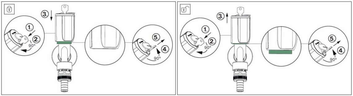Praktikus: Nyitott állapotban a fogantyú alsó végén egy zöld gyűrű látható. Ez az optikai jelzés figyelmezteti a felhasználót arra, hogy a vízvételi hely használat után nem véletlenül maradt-e biztosítatlan. A kulcsot csak egyértelmű helyzetben (nyitott vagy zárt) lehet eltávolítani.