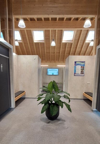 A zuhanyzókban összesen 13 SCHELL LINUS D-C-T falba építhető zuhanyt, valamint VITUS kézi zuhanyfejekkel ellátott VITUS zuhanygarnitúrát szereltek fel. A LINUS falba építhető zuhanyok CVD-érintőelektronikával és automatikus zárással rendelkeznek. Ez megakadályozza a vízpazarlást, mivel a vízáramlás egy előre beállított idő után automatikusan leáll. Ez támogatja a kemping fenntartható működését. A kefélt rozsdamentes acél felületű sárgaréz előlap különösen robusztus, és ellenáll a változó kempingezők általi intenzív használatnak. A ThermoProtect termosztát maximális biztonságot nyújt zuhanyzás közben. Ez megbízhatóan véd a forrázás ellen még a hidegvízvezeték meghibásodása esetén is. Különösen a többek között gyermekek által használt zuhanyzókban elengedhetetlen az ilyen forrázásvédelem a túl forró víz okozta sérülések megelőzése érdekében. A VITUS zuhanygarnitúra rugalmas zuhanyzási komfortot kínál az állítható magasságú VITUS háromsugaras kézi zuhanyfejjel.