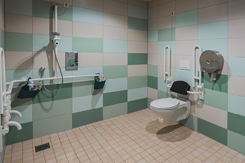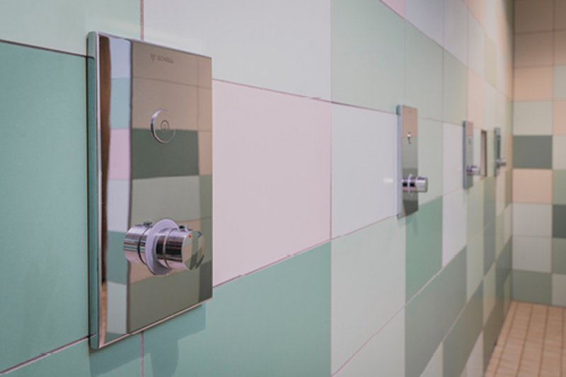 Bij de wastafels werden elektronische wastafelkranen PURIS E gebruikt, die met SWS gekoppeld werden. Dankzij de contactloze activering via infraroodsensor dragen ze bij aan een betere gebruikershygiëne. Aangezien het water alleen stroomt als zich handen in het sensorbereik bevinden en de waterstroom na het handenwassen automatisch stopt, spaart PURIS E op doeltreffende wijze water en energie. Gebruikers kunnen ook de geplaatste wastafelkranen PURIS SC met weinig contact door een eenmalige bediening activeren. In de douches werden hoogwaardige en stevige douchepanelen LINUS DP-C-T en inbouwdouches LINUS D-C-T geïnstalleerd en via SWS gekoppeld. De waterstroom ervan kan via CVD-touch-elektronica geactiveerd worden en sluit automatisch na een vooraf ingestelde tijd – zo dragen ook deze bij aan een beperkt waterverbruik. Voor een comfortabel douchegenot zorgt de tegen vandalisme beschermde douchekop Comfort Flex met instelbare hellingshoek en aangename softstraal. Dankzij de ThermoProtect-thermostaat, die in beide varianten van de douchekranen voorhanden is, zijn de bezoekers van het recreatiebad tijdens het douchen prima beschermd tegen brandwonden. De ingestelde watertemperatuur blijft namelijk constant – ook bij drukschommelingen in het systeem. Bij uitval van de koudwatertoevoer zorgt de thermostaat zelfs dat de waterstroom volledig stopt om doeltreffend verbrandingen te voorkomen. In de wc’s werden de wc-modules MONTUS met bijpassende bedieningsplaten van SCHELL geïnstalleerd.