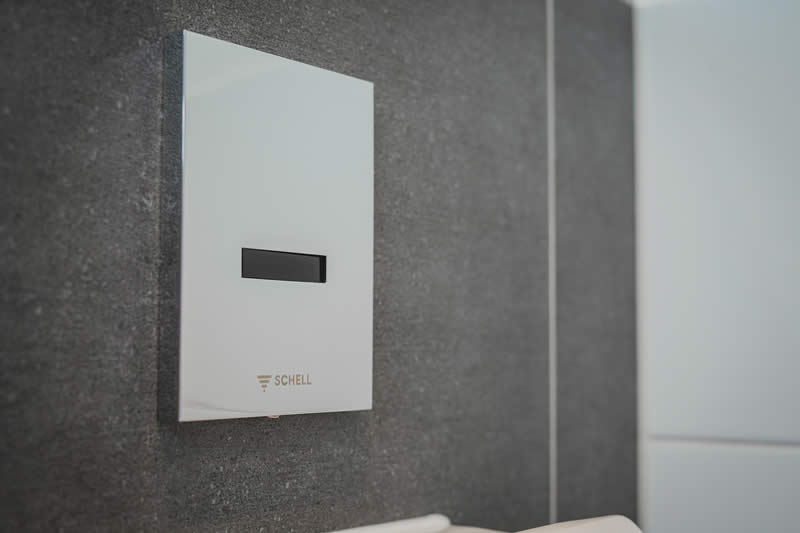 Bij het urinoir in de heren-wc werd de urinoirsturing EDITION E geïnstalleerd. De elektronische spoelinrichting wordt contactloos en hygiënisch via infraroodsensor bediend. Het sensorvenster bevindt zich op de verchroomde frontplaat van de spoelinrichting. Bovendien beschikt EDITION E over een optionele spoeling voor geurafsluiting en een energiespaarmodus.