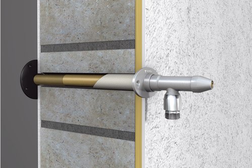 De vorstbestendige armatuur POLAR II is verkrijgbaar als montageset voor de nieuwbouw en als inbouwklare variant voor de montage in bestaande gebouwen. In de nieuwbouw wordt de armatuur met een G½-schroefdraadaansluiting op de toevoerleidingen aangesloten. De mon-tageset voor bestaande gebouwen heeft een geïntegreerde koperen pijpaansluiting met een diameter van 15 mm. In beide uitvoeringen maakt de traploos verstelbare buis een moei-teloze, op de millimeter nauwkeurige afstelling mogelijk: de muurdoorvoer wordt na montage met de meegeleverde inkortmal op de juiste lengte ingekort.